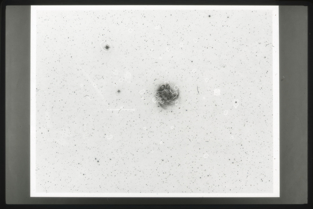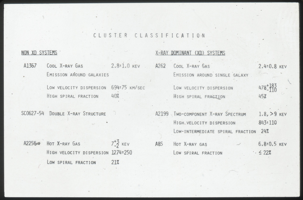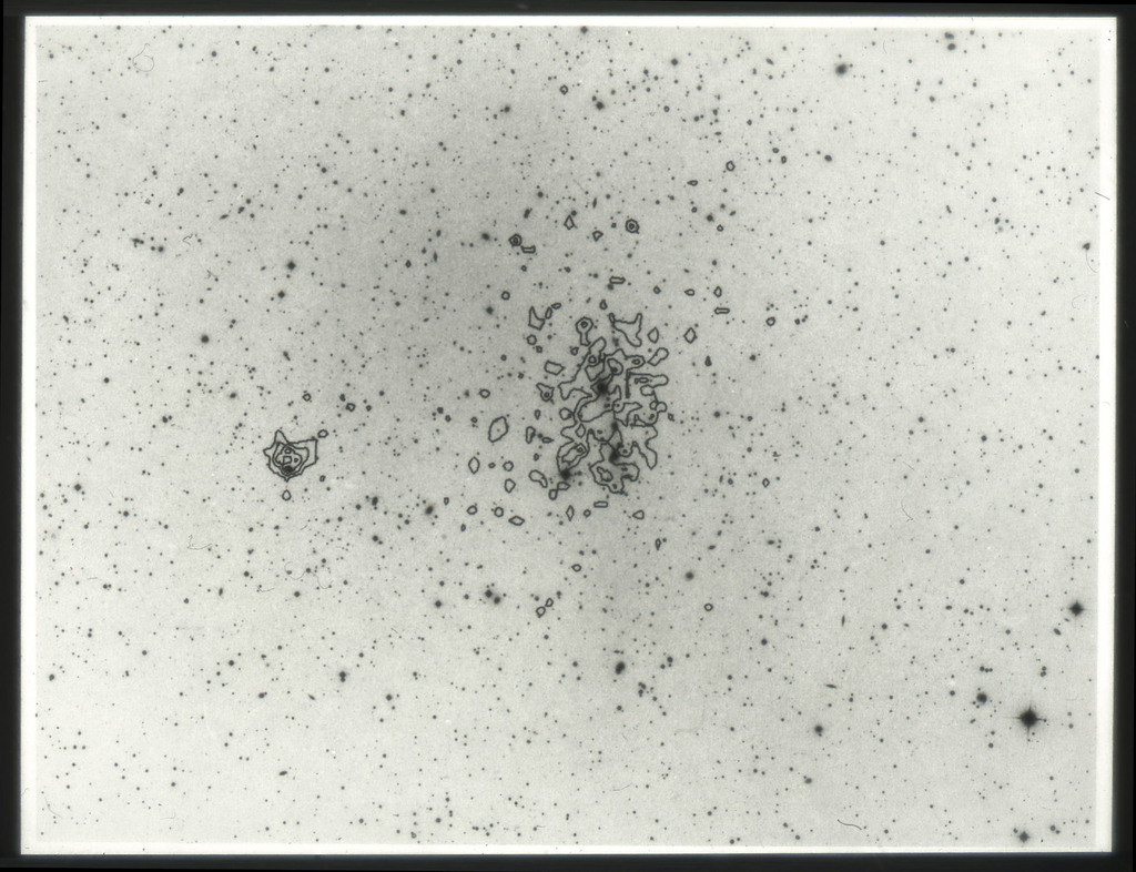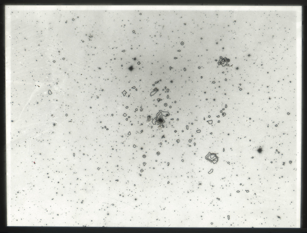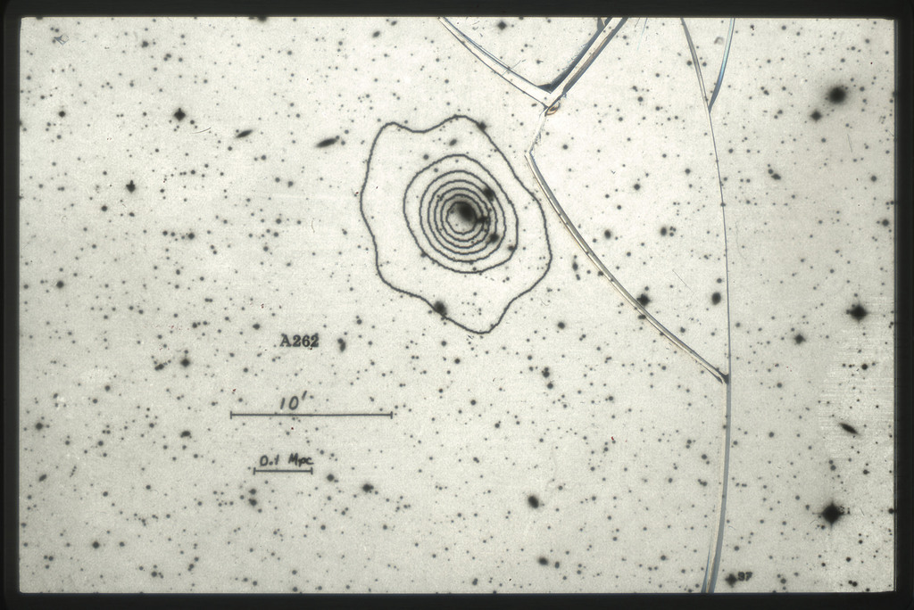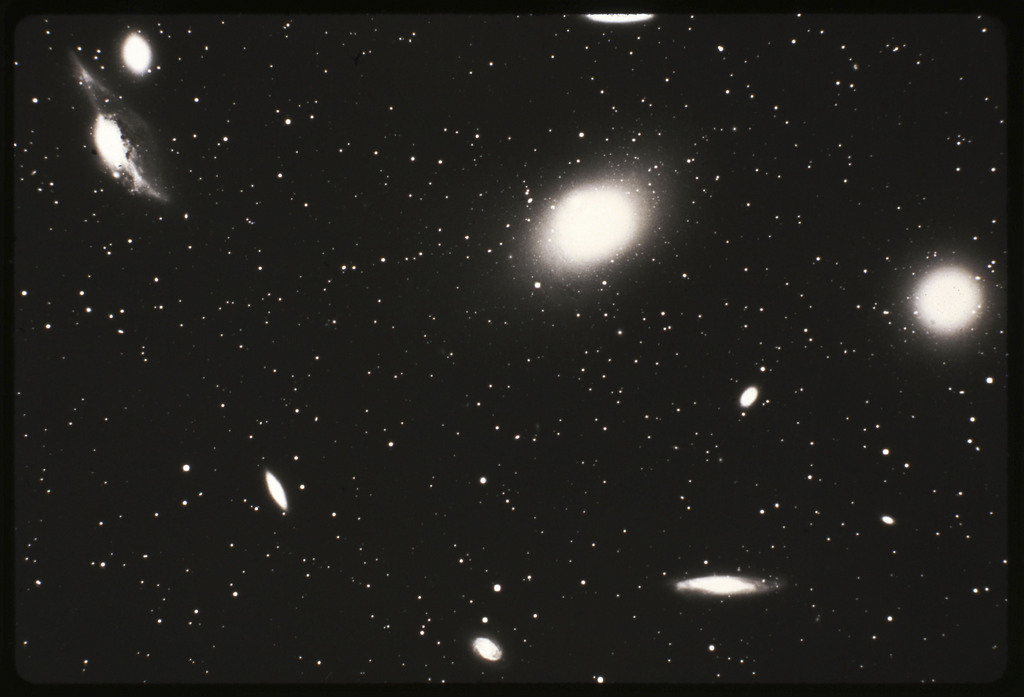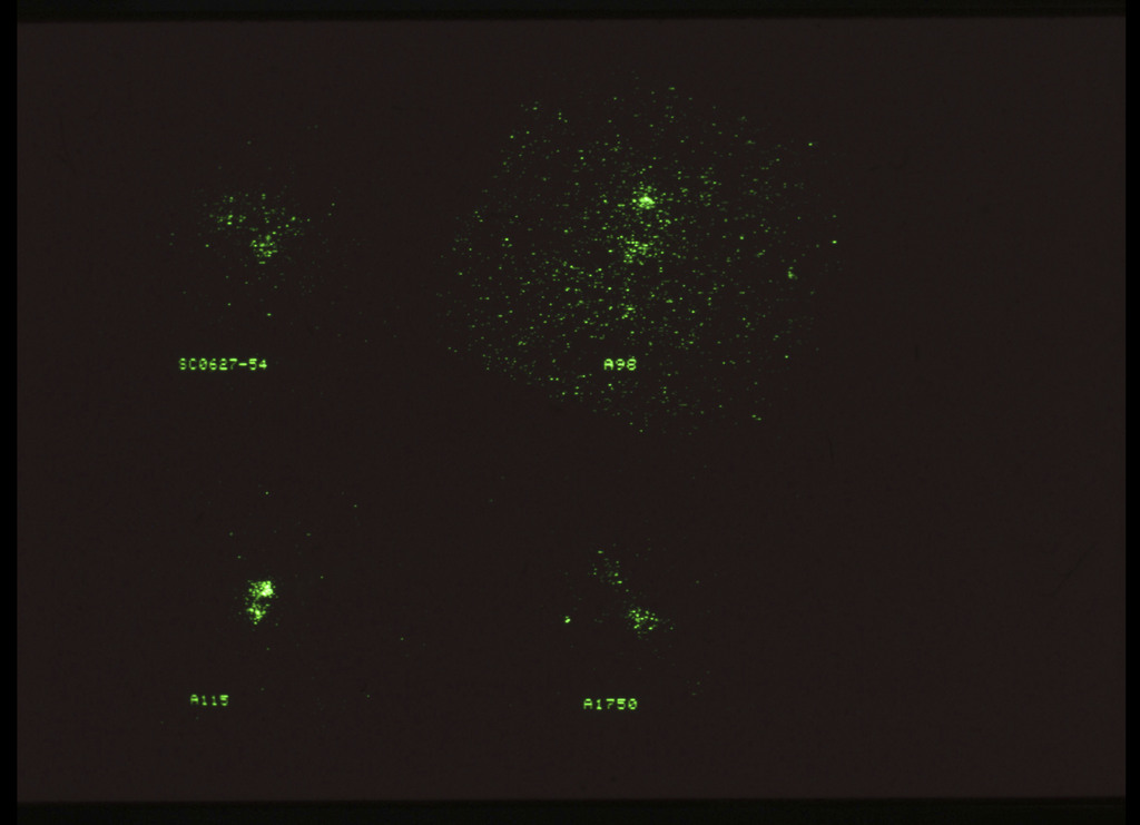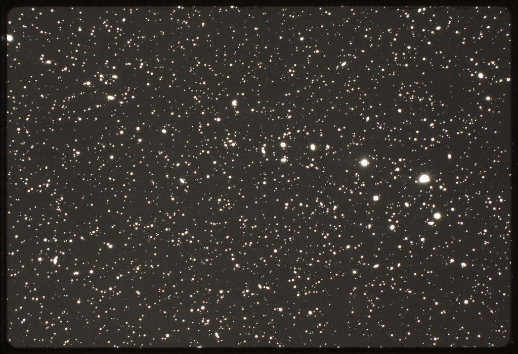 E/1003 A 1367. Optical picture of the cluster contains several hundred individual galaxies, the brightest of which are seen as the extended or fuzzy dark spots. |
