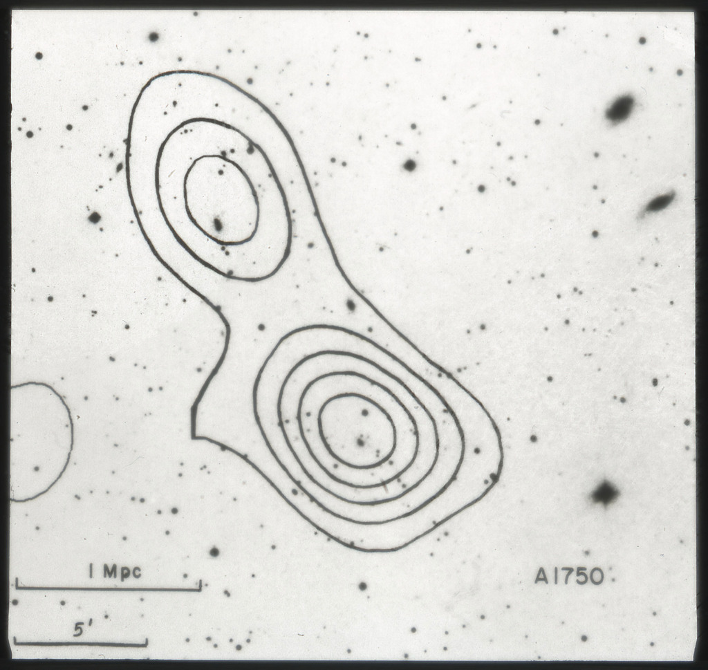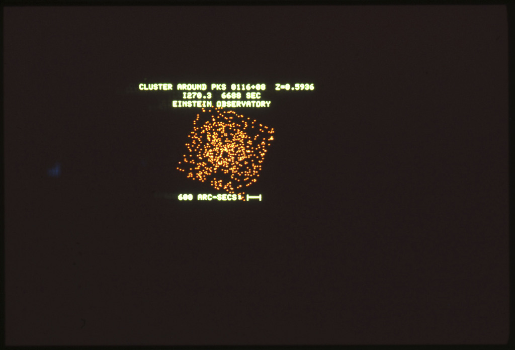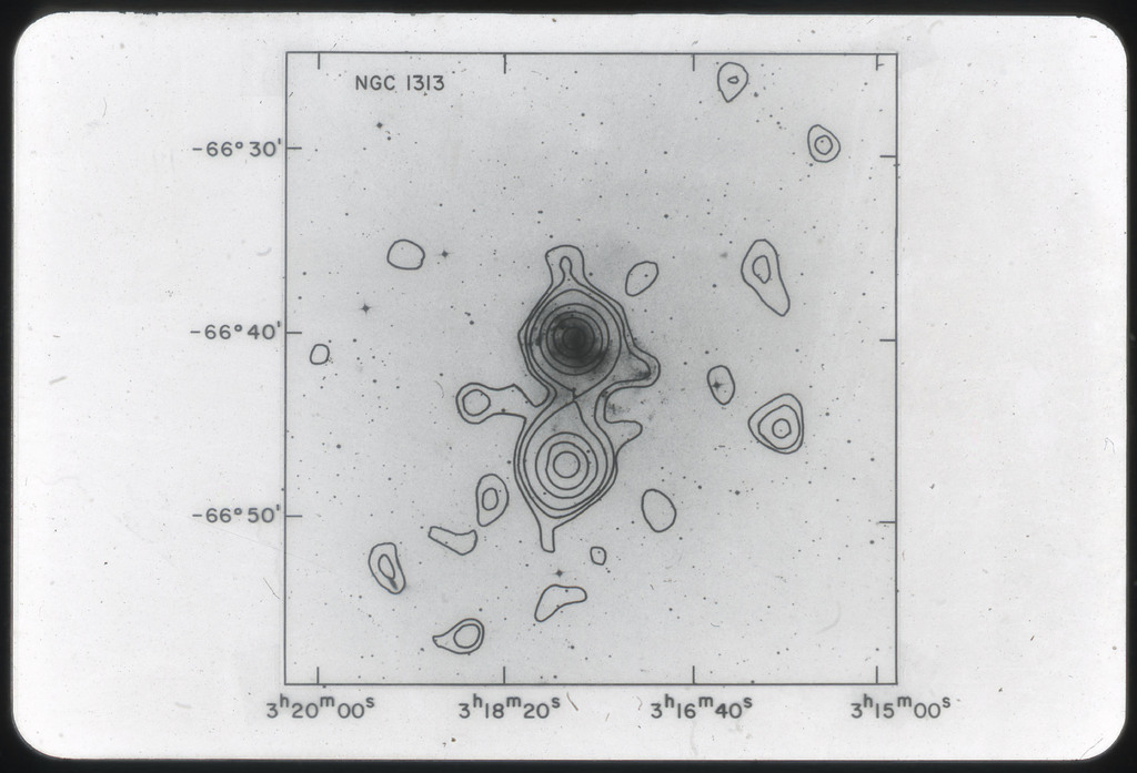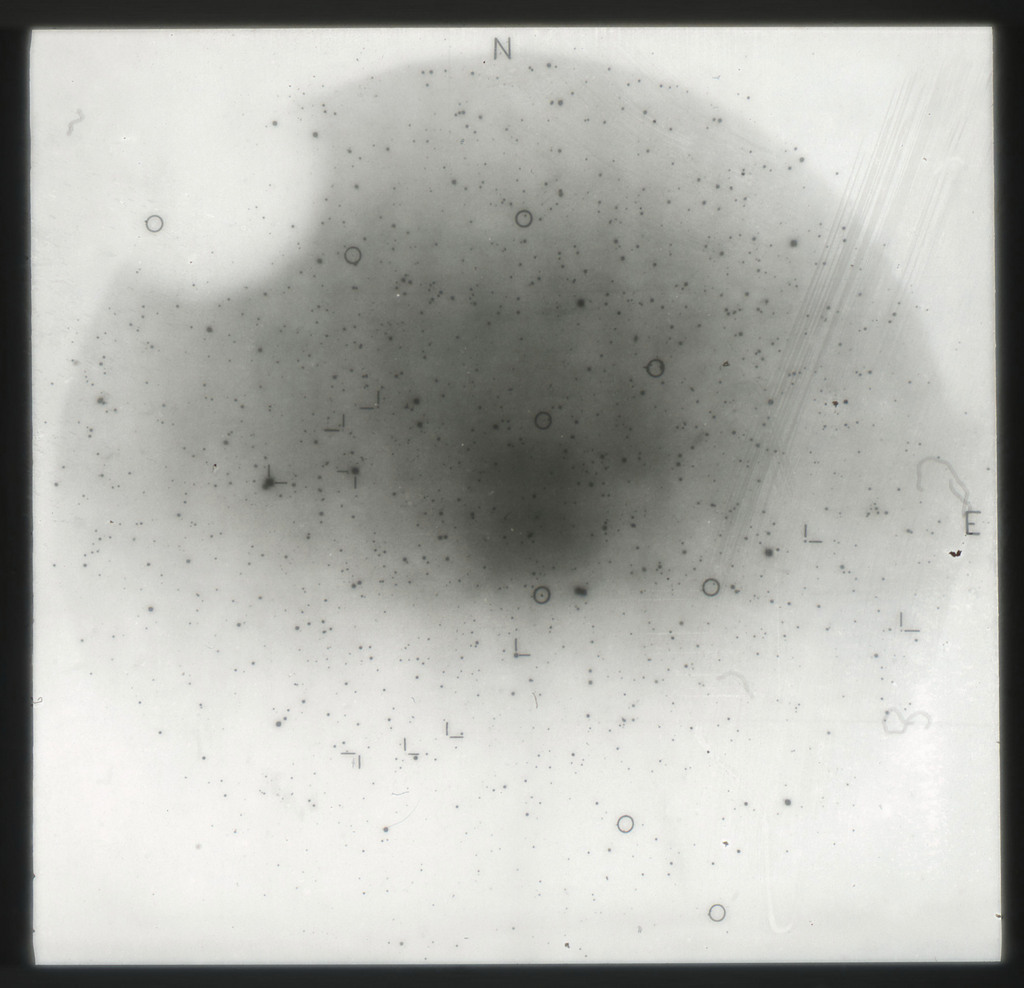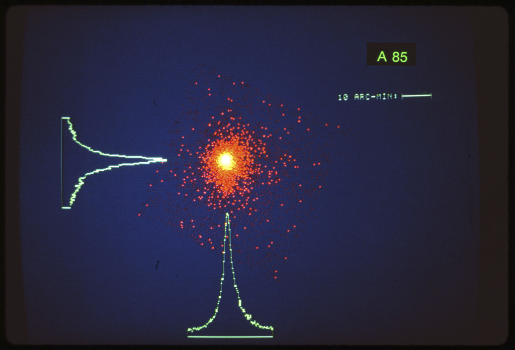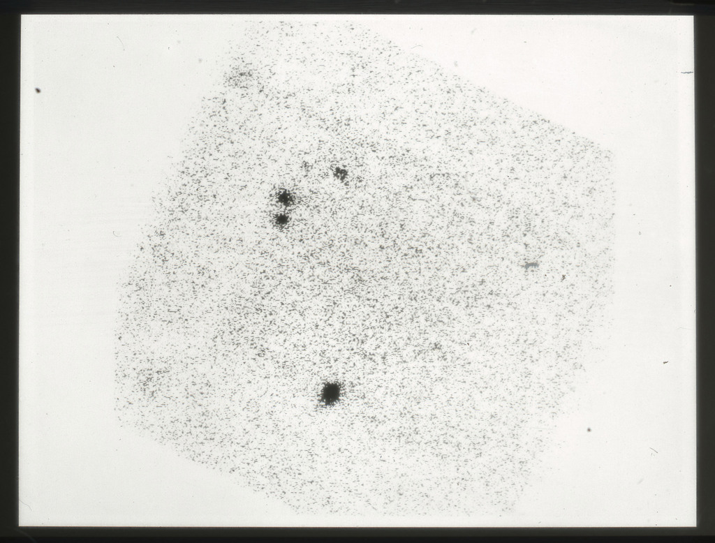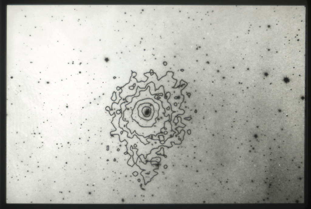 E/1003 A 1367. Optical picture of the cluster contains several hundred individual galaxies, the brightest of which are seen as the extended or fuzzy dark spots. |
