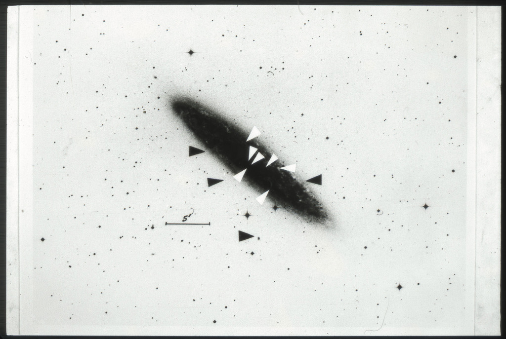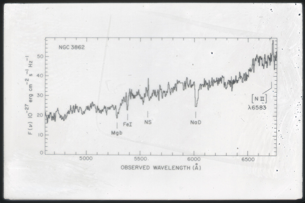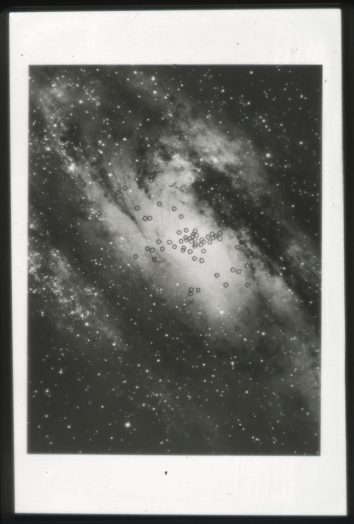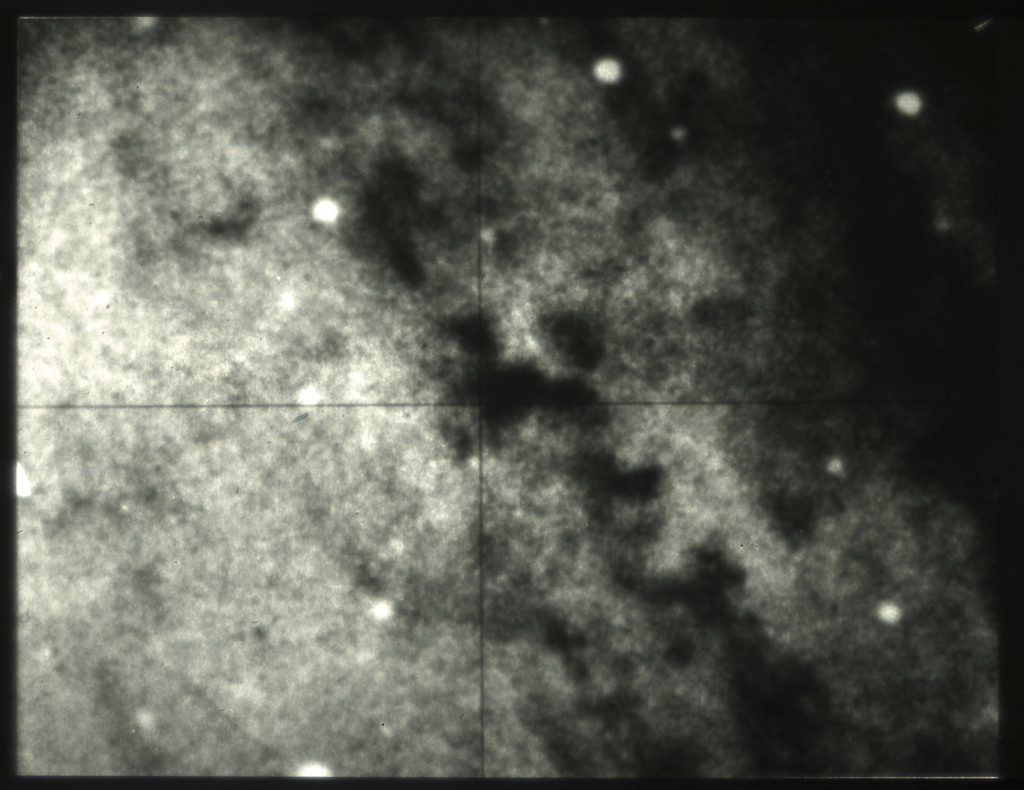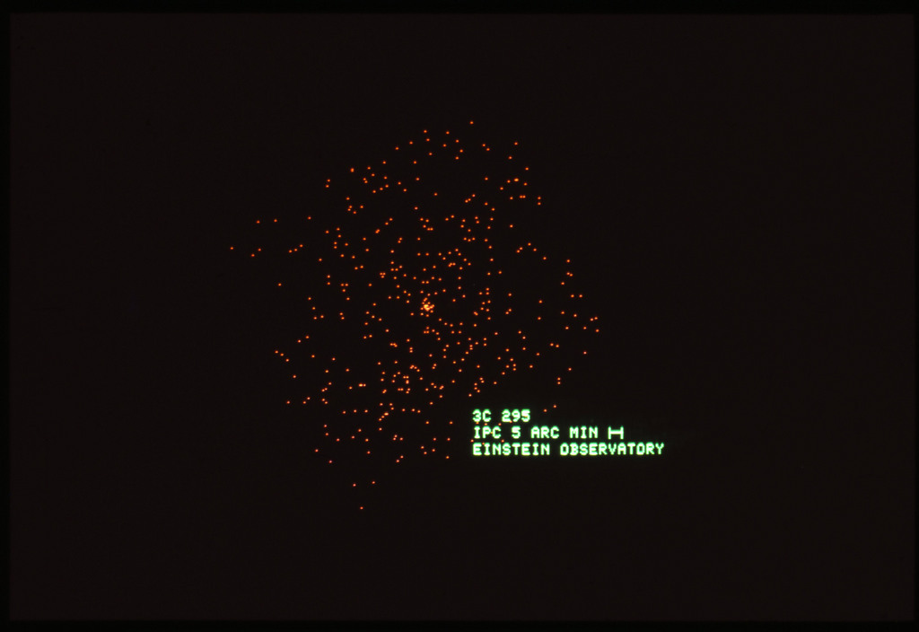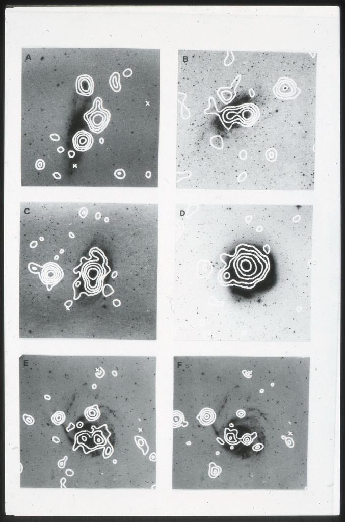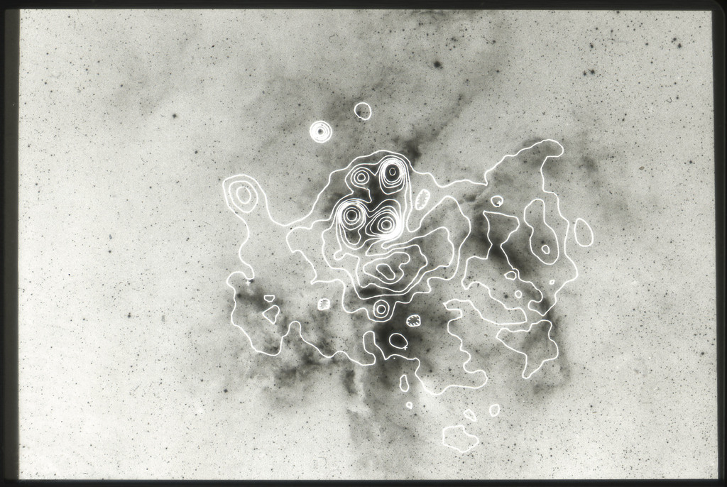 E/1003 A 1367. Optical picture of the cluster contains several hundred individual galaxies, the brightest of which are seen as the extended or fuzzy dark spots. |