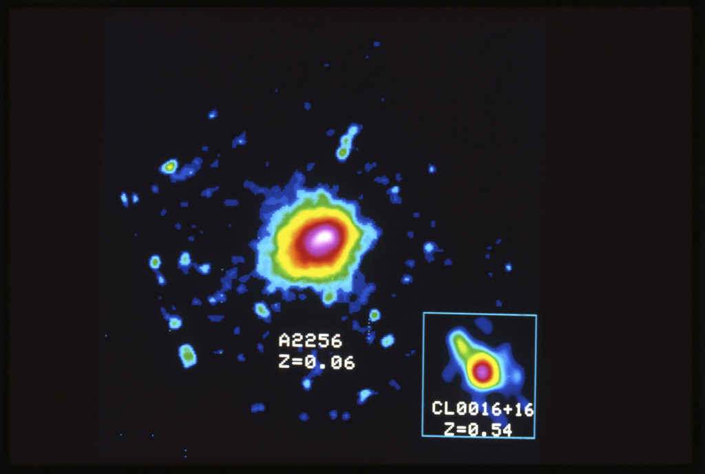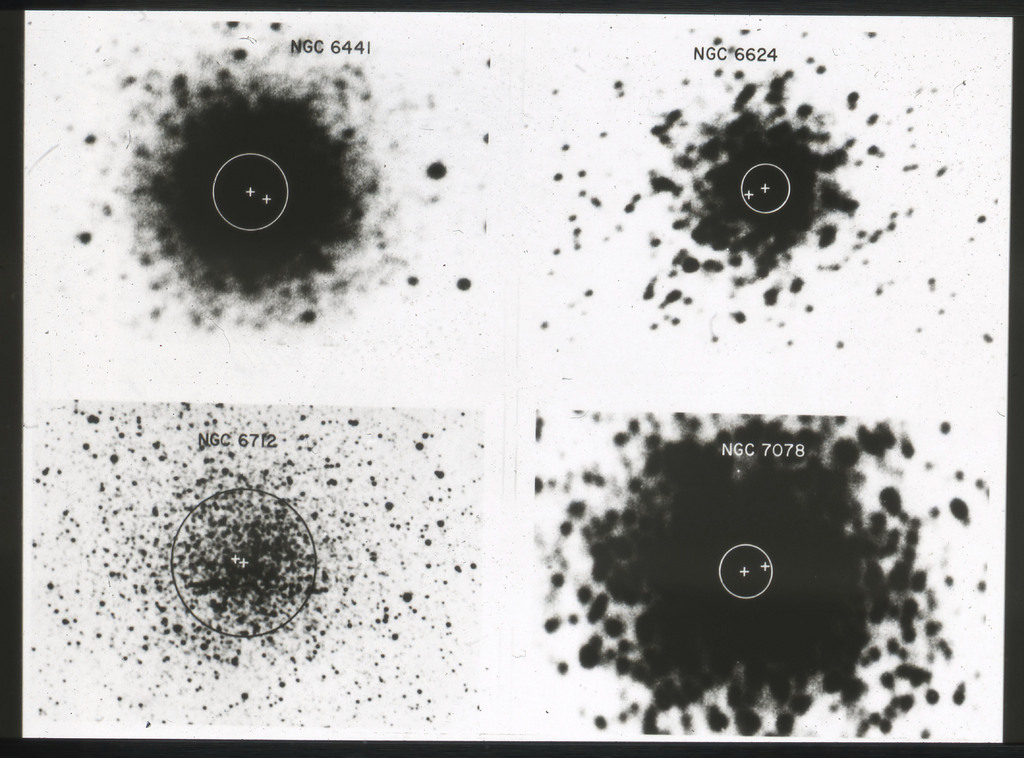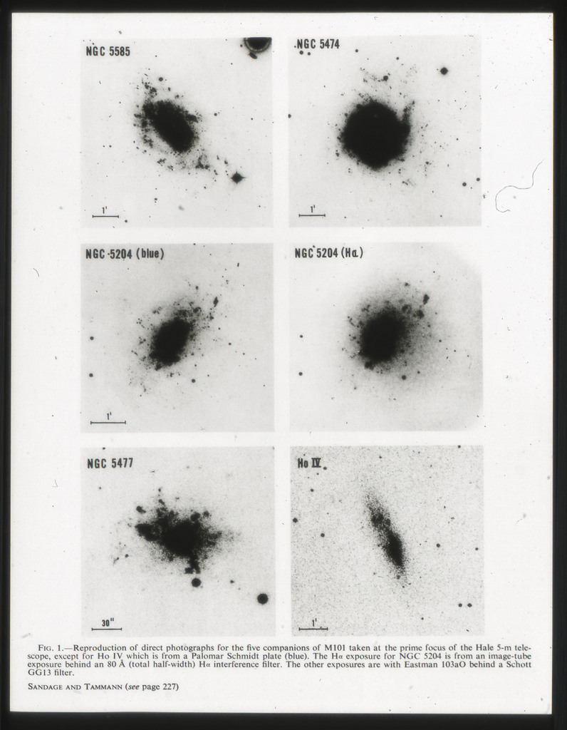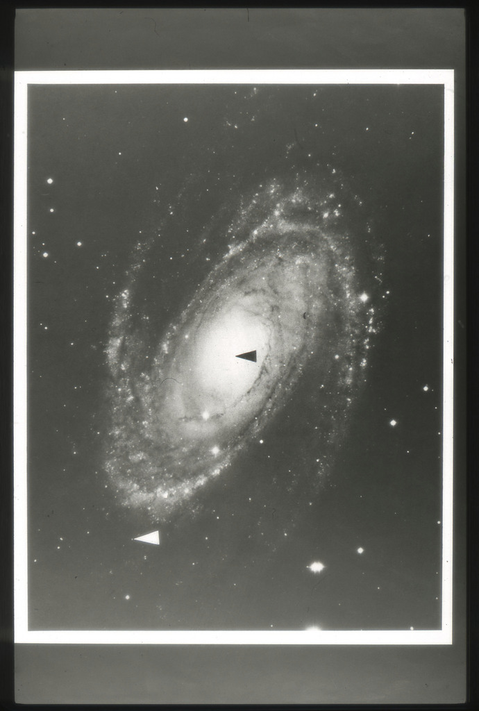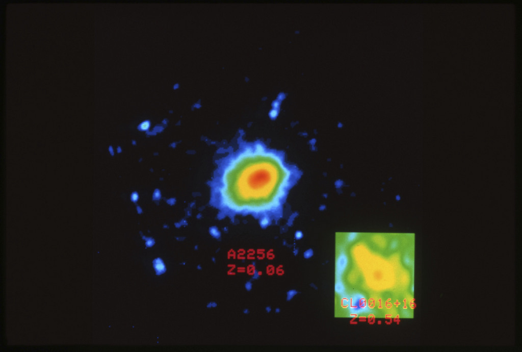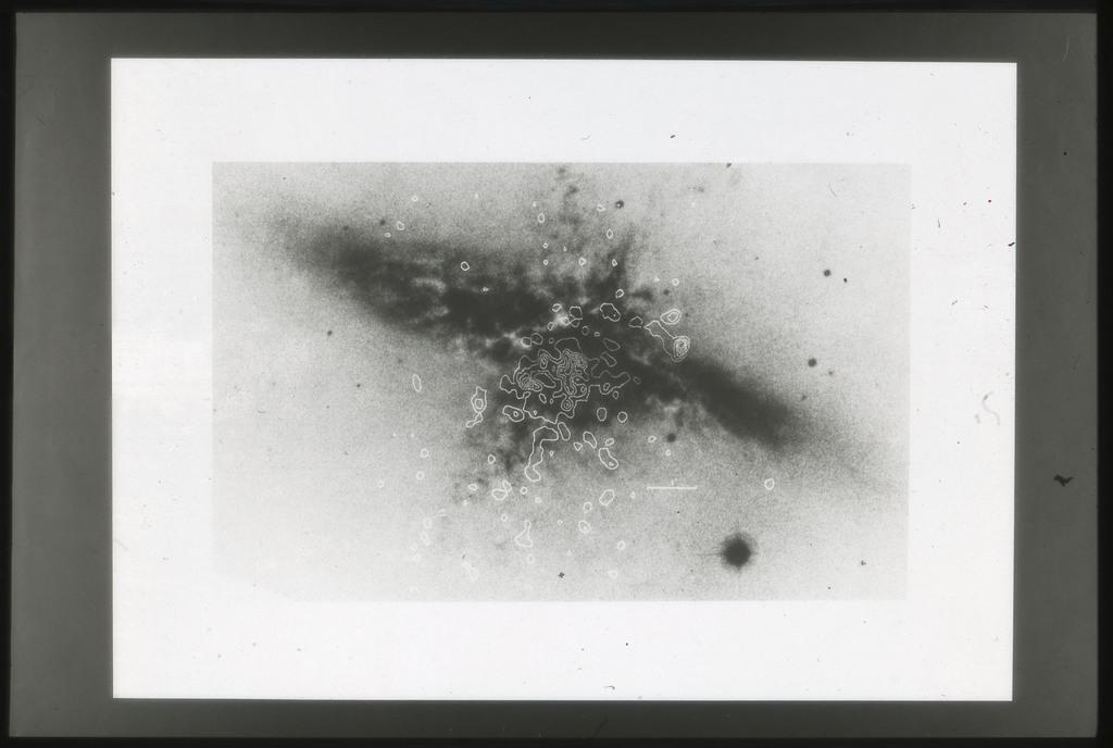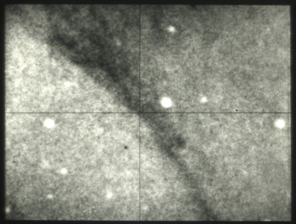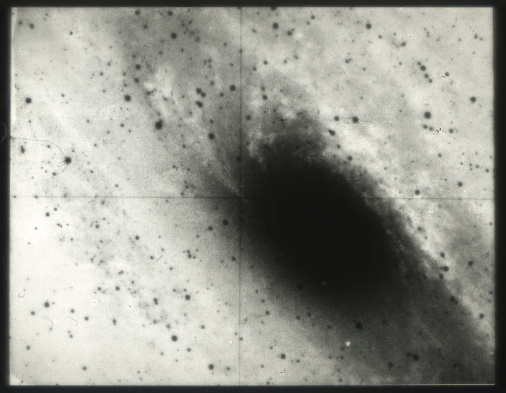 E/1003 A 1367. Optical picture of the cluster contains several hundred individual galaxies, the brightest of which are seen as the extended or fuzzy dark spots. |