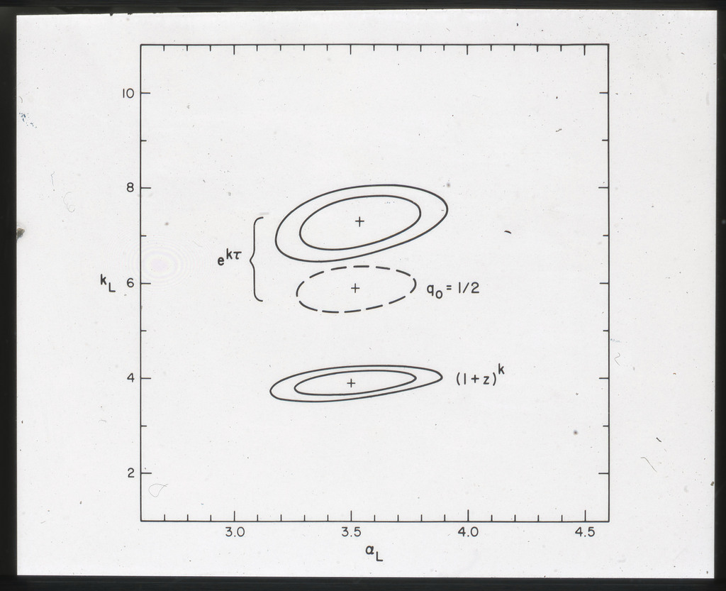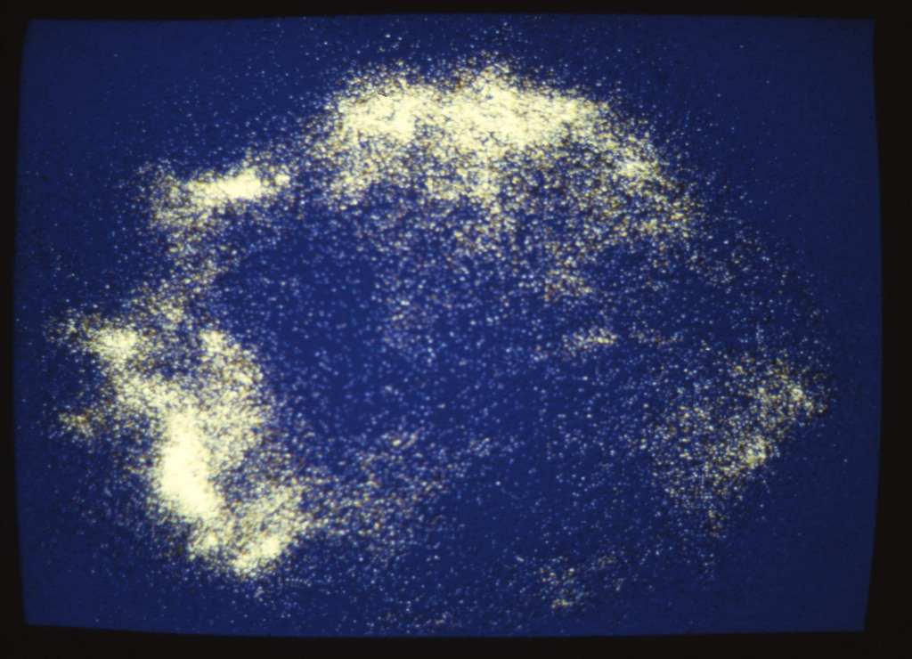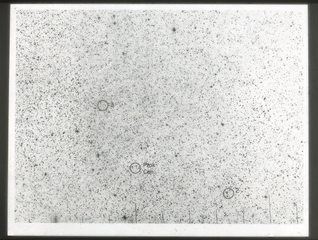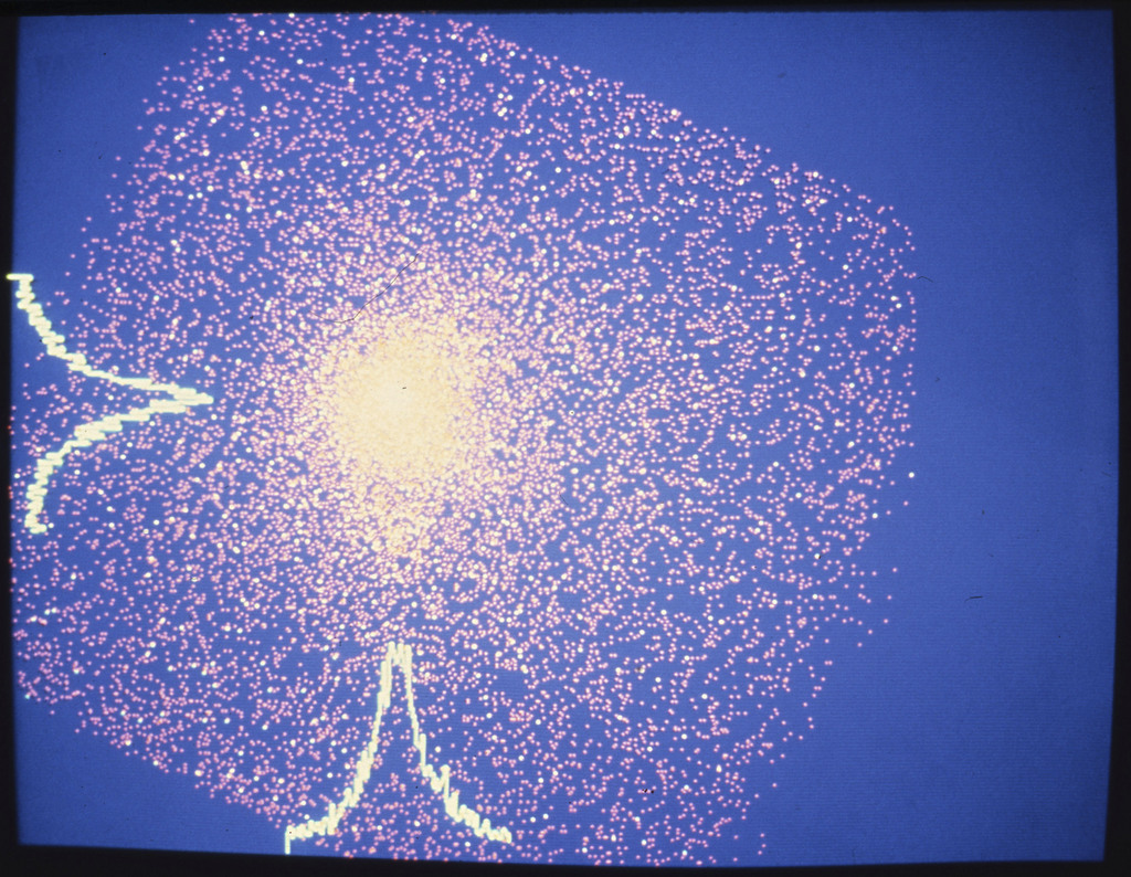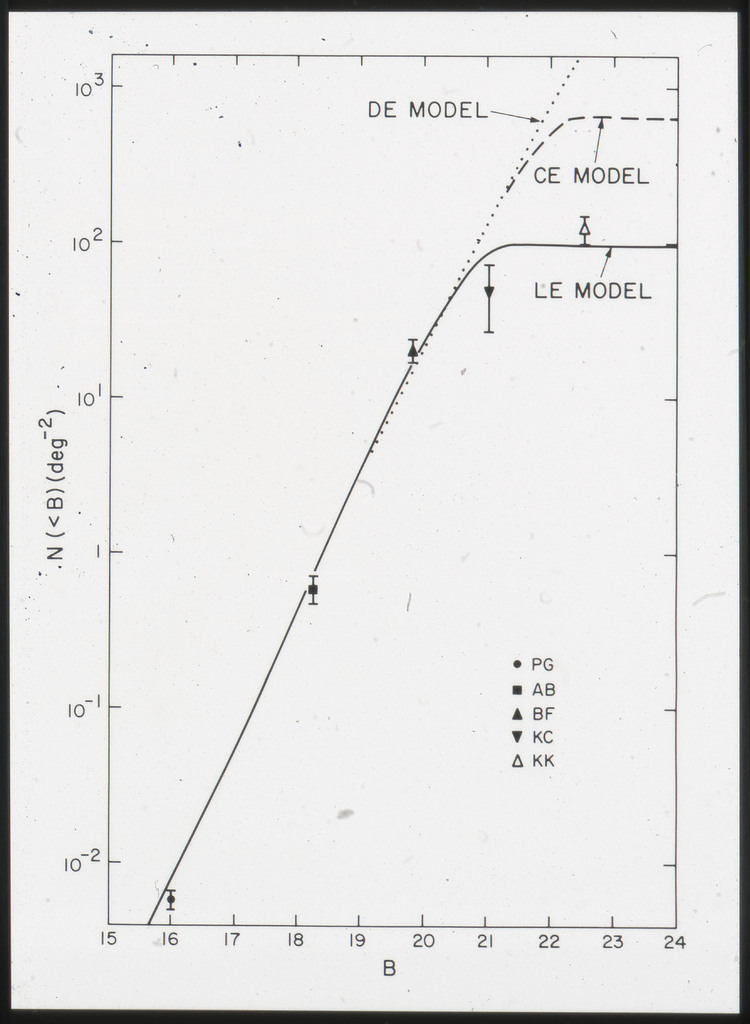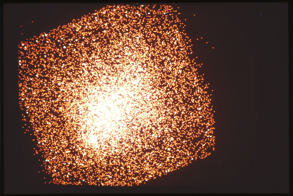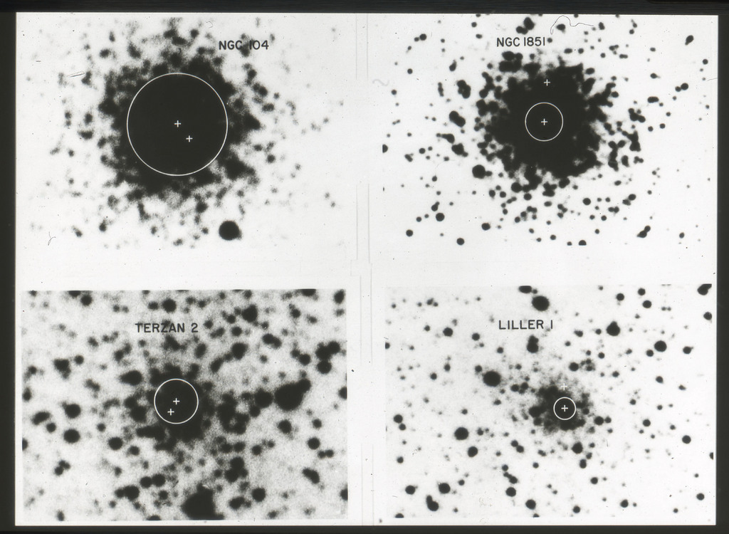 E/1003 A 1367. Optical picture of the cluster contains several hundred individual galaxies, the brightest of which are seen as the extended or fuzzy dark spots. |