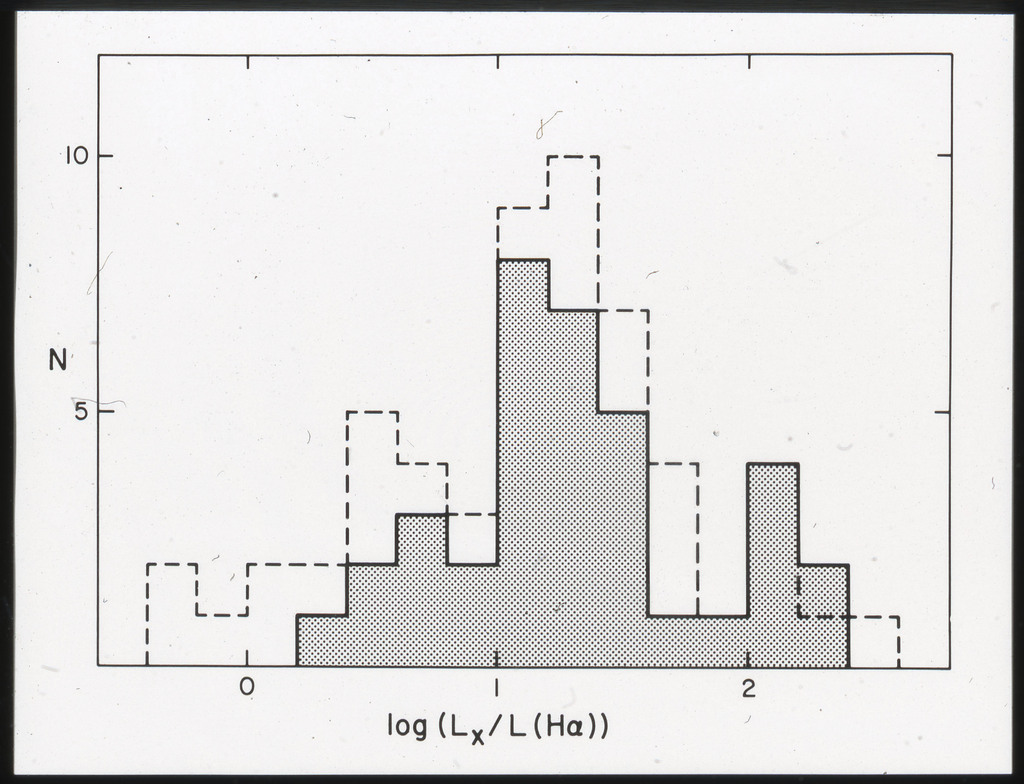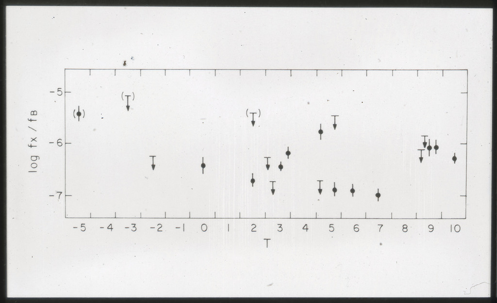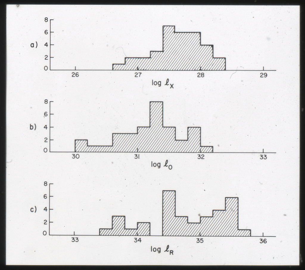 E/996 Distribution (a) of the X-ray luminosities L_x for the galaxies in the sample, and (b) Distribution of the X-ray to optical flux ratios of f_x/f_B. The hatched box represents NGC6876 for which only a Harvard Magnitude is listed in deVaucouleurs, de Vaucouleurs, and Corwin (1976). |