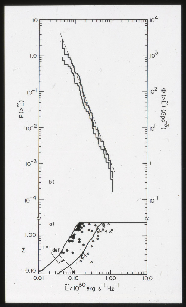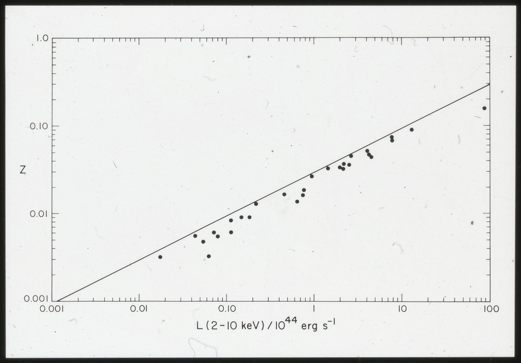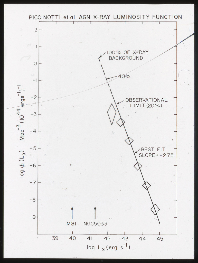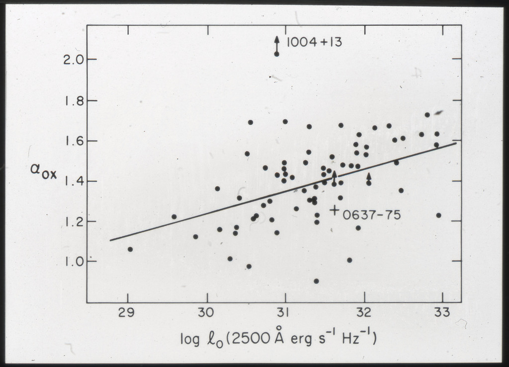 E/1002 The monochromatic X-ray luminosity of 3CR quasars and 3CR galaxies plotted as a function of optical luminosity. Dashed line represents the best fit to the 3CR quasar data. The solid lines represent how this best fit is modified when the effect of the whole galaxy is considered for three different optical luminosities. |