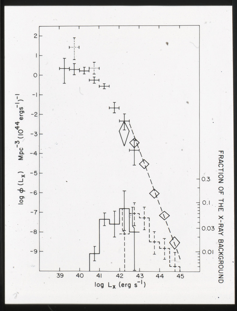 E/1008 Comparison between the x-ray, H alpha, blue light (disk and arms), far-infrared, neutral hydrogen, molecular hydrogen (derived from CO) and 21~cm radio continuum surface brightness profiles. The x-ray points are plotted on a composite of Figure~6 from Scoville and Young (1983). The x-ray data points have been corrected for the inclination of M51 (i = 20 deg) as in Scoville and Young (1983). X-ray points for R < 2~kpc are not plotted because off scale. All curves have been arbitrarily normalized. |