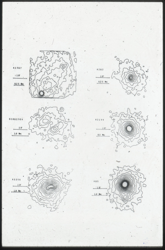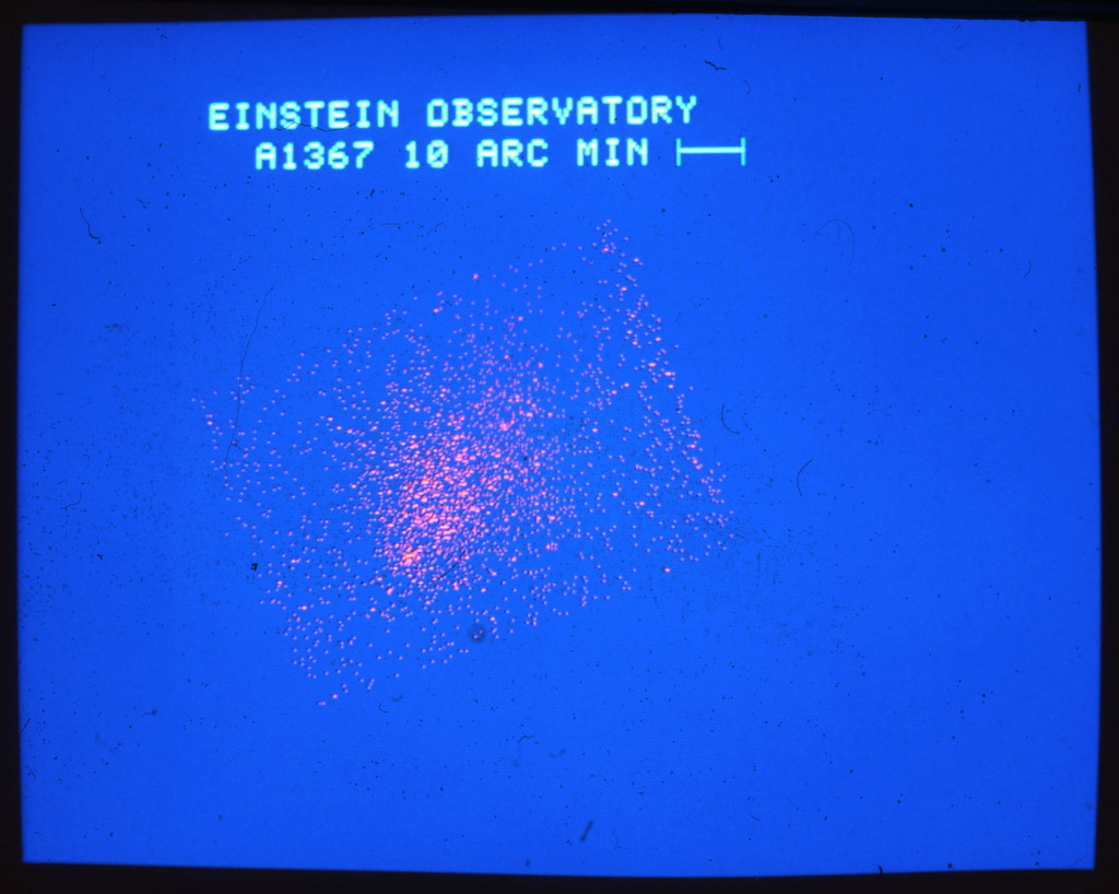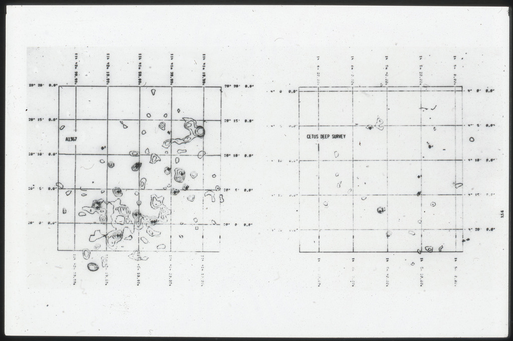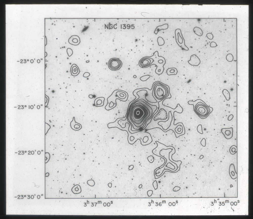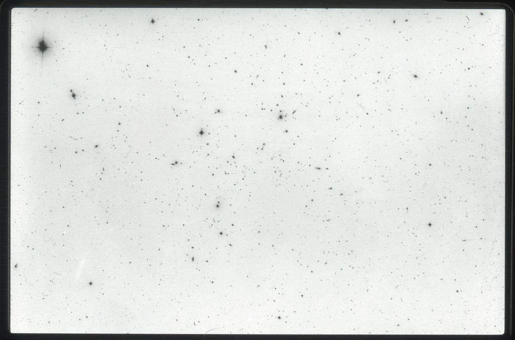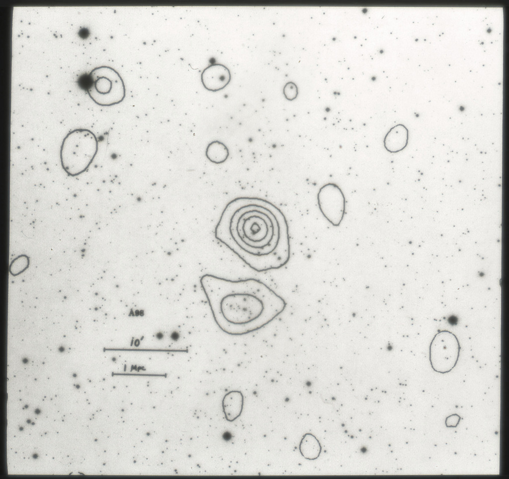 E/1003 A 1367. Optical picture of the cluster contains several hundred individual galaxies, the brightest of which are seen as the extended or fuzzy dark spots. |