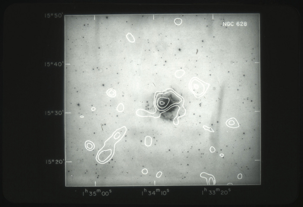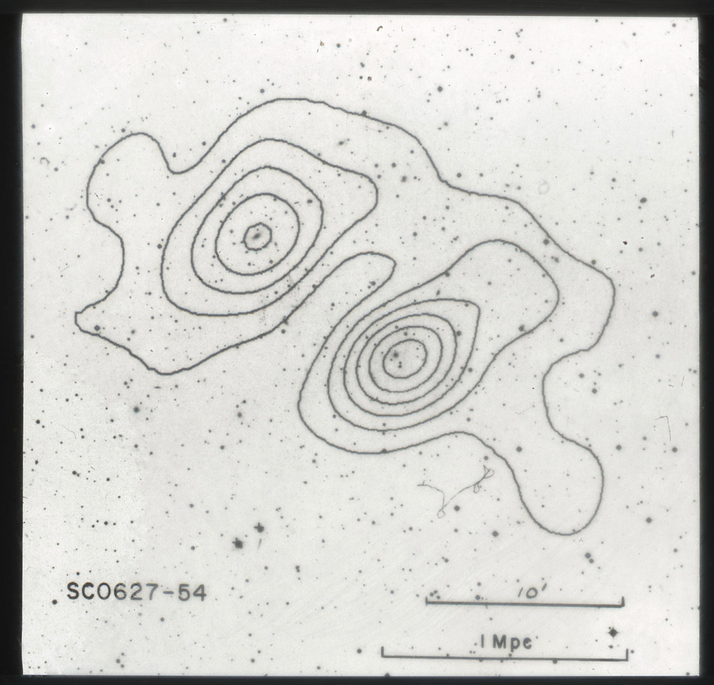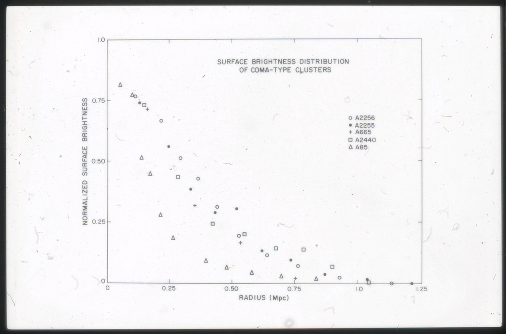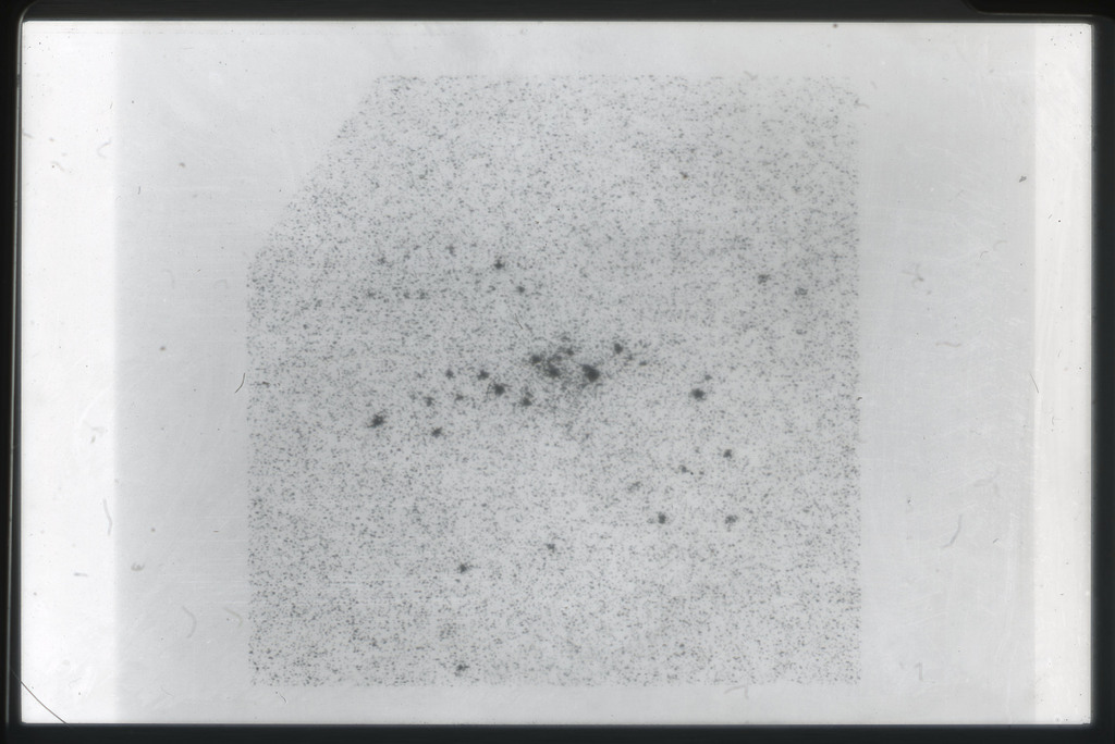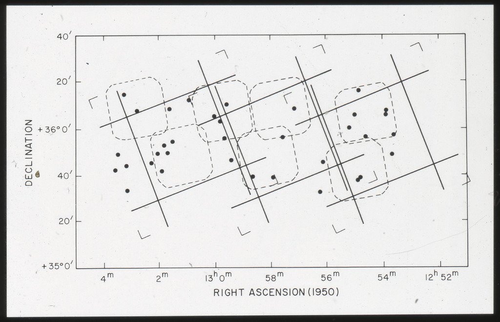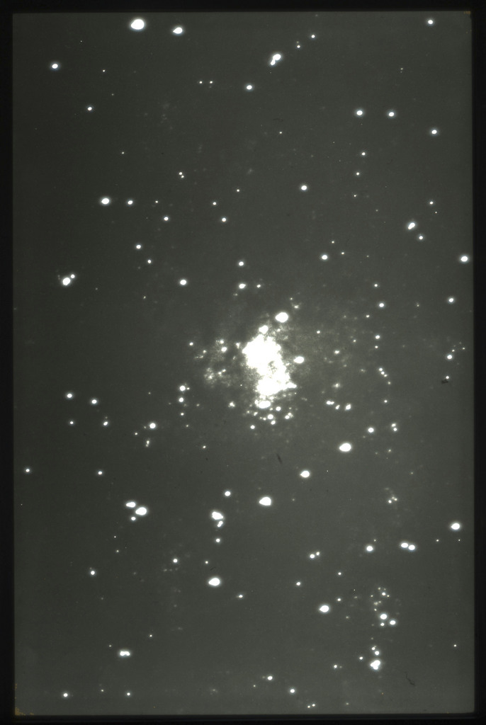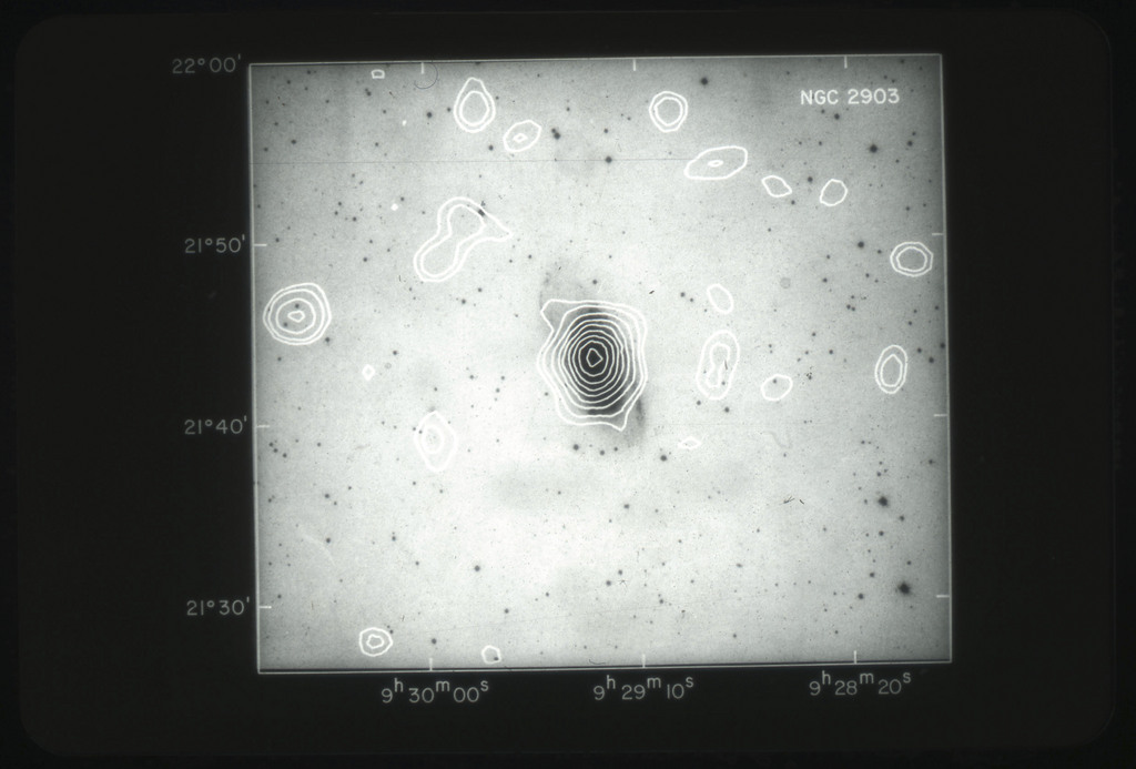 E/1003 A 1367. Optical picture of the cluster contains several hundred individual galaxies, the brightest of which are seen as the extended or fuzzy dark spots. |