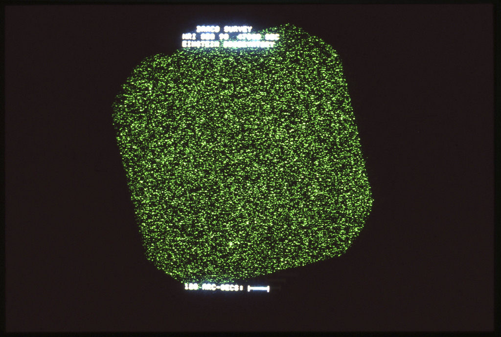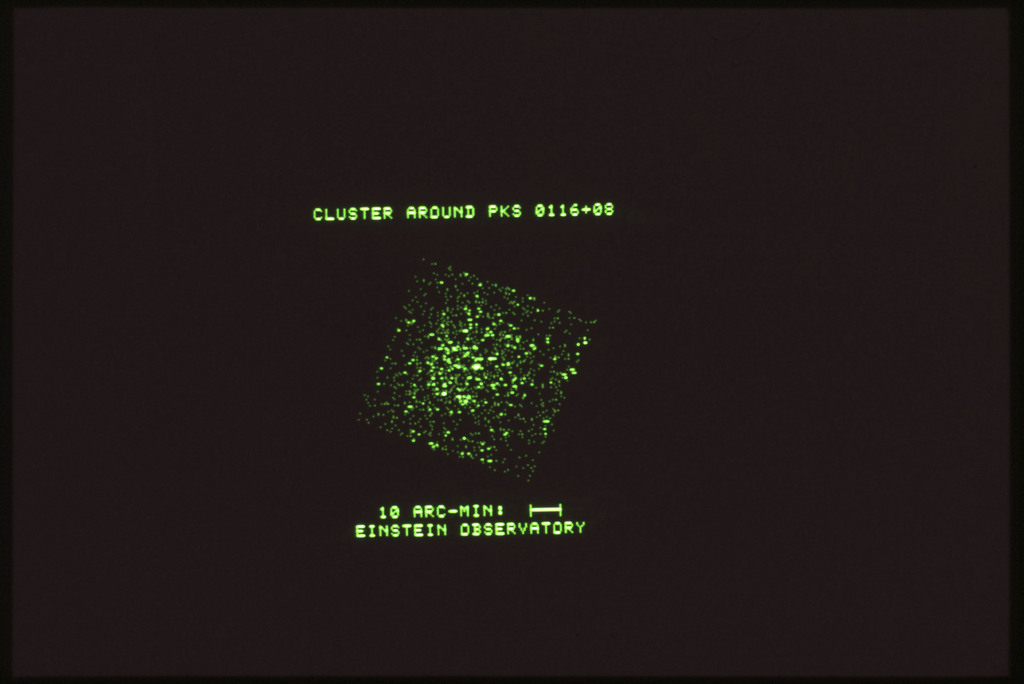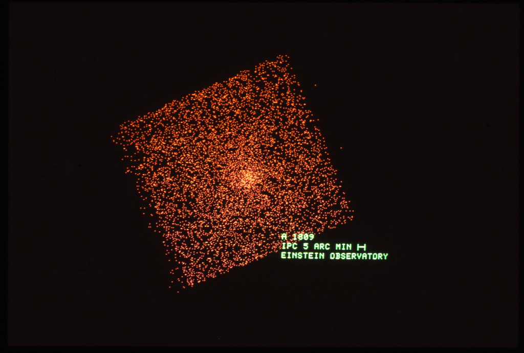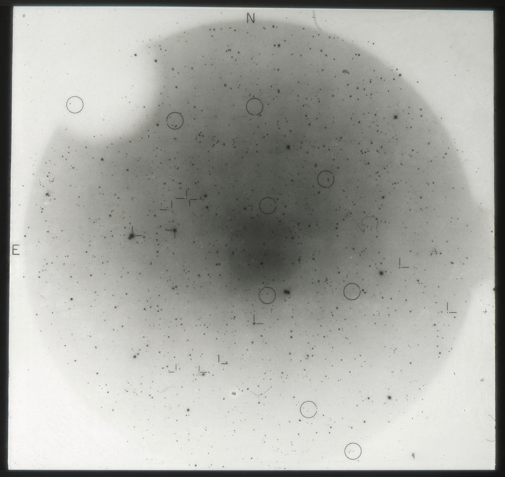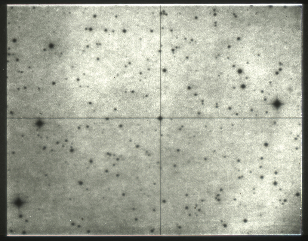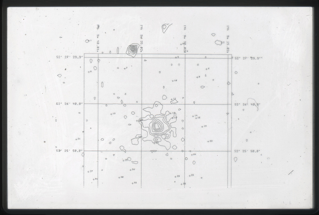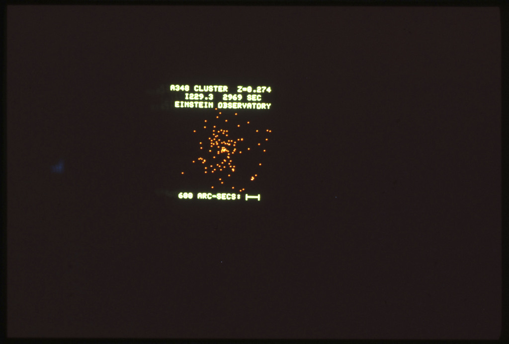 E/1003 A 1367. Optical picture of the cluster contains several hundred individual galaxies, the brightest of which are seen as the extended or fuzzy dark spots. |