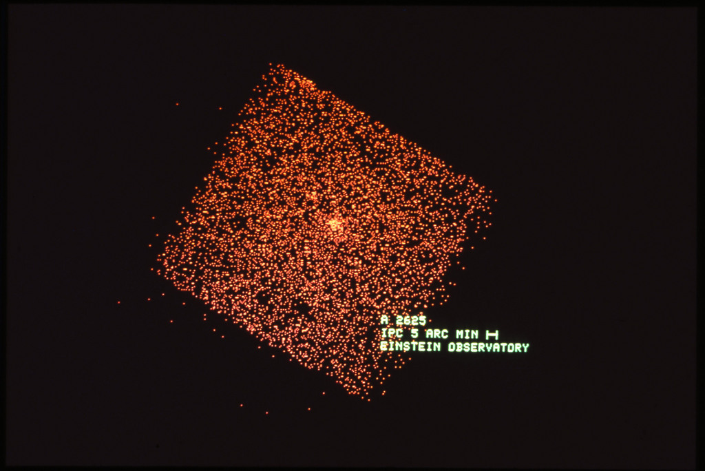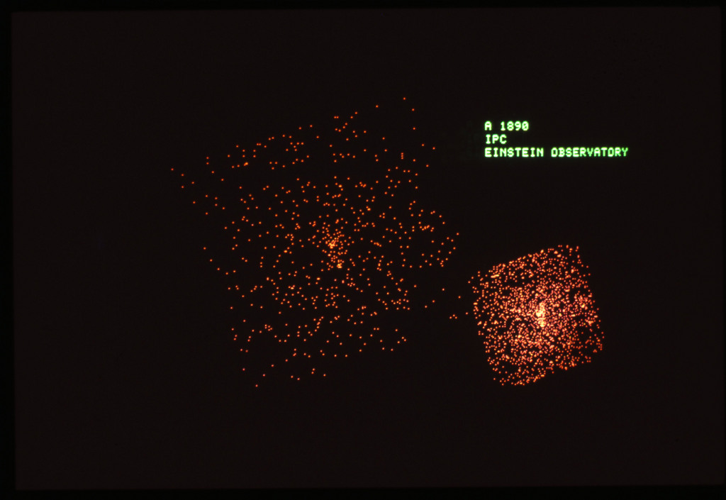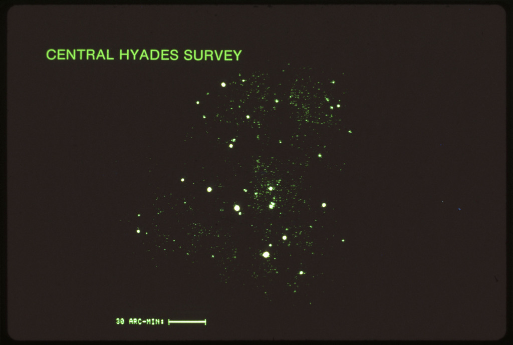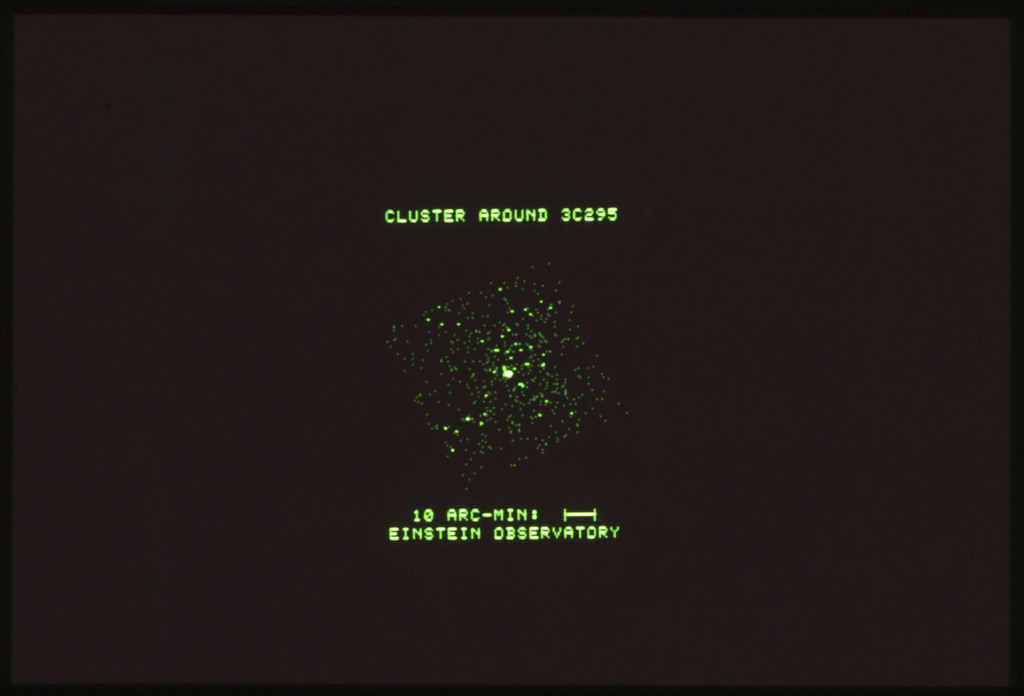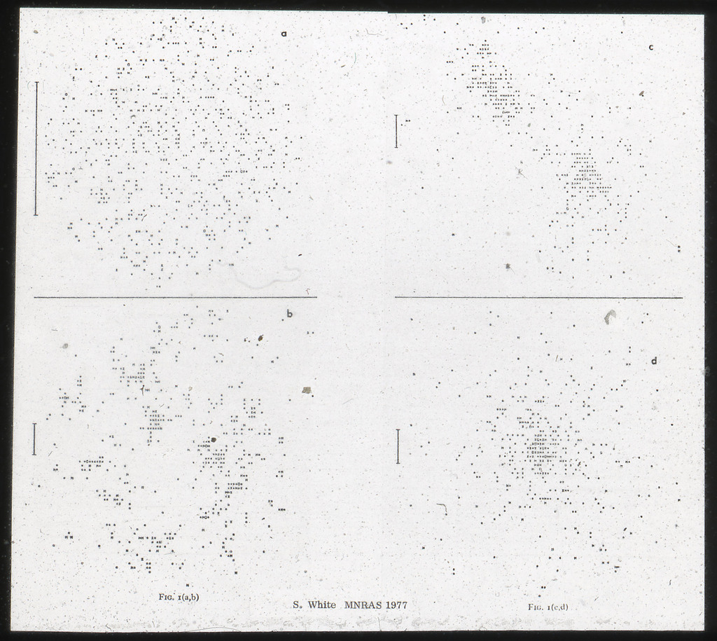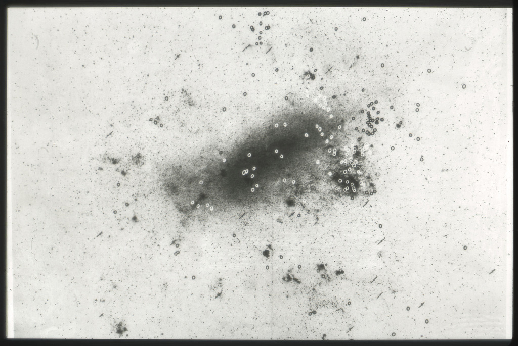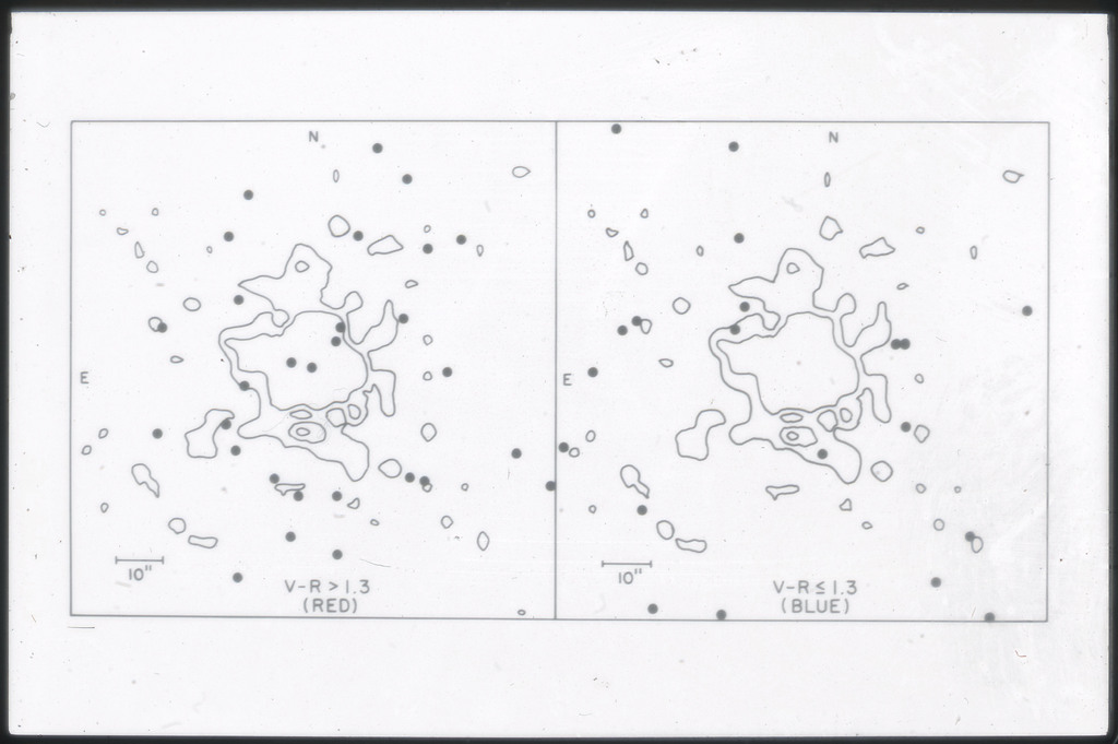 E/1003 A 1367. Optical picture of the cluster contains several hundred individual galaxies, the brightest of which are seen as the extended or fuzzy dark spots. |