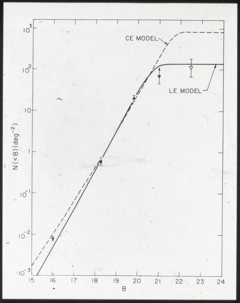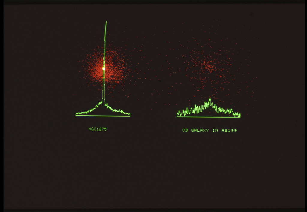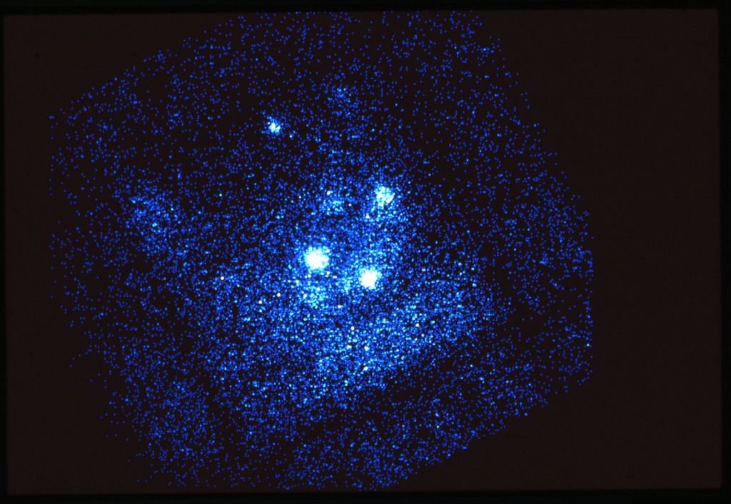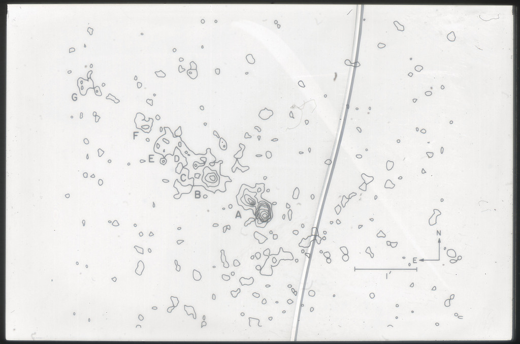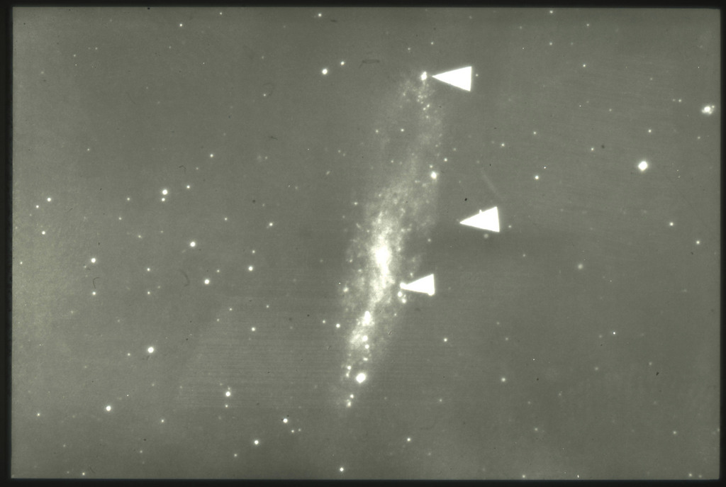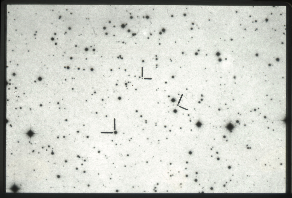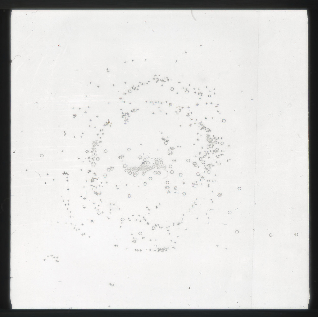 E/1003 A 1367. Optical picture of the cluster contains several hundred individual galaxies, the brightest of which are seen as the extended or fuzzy dark spots. |