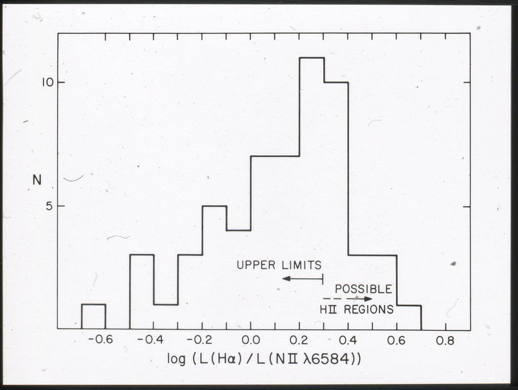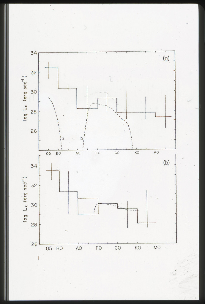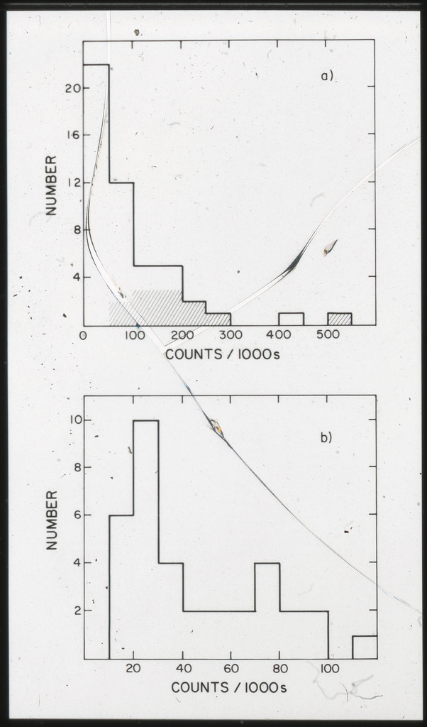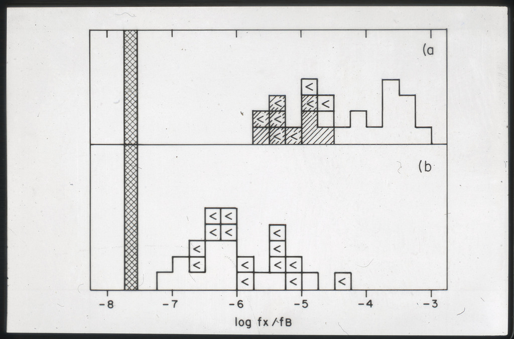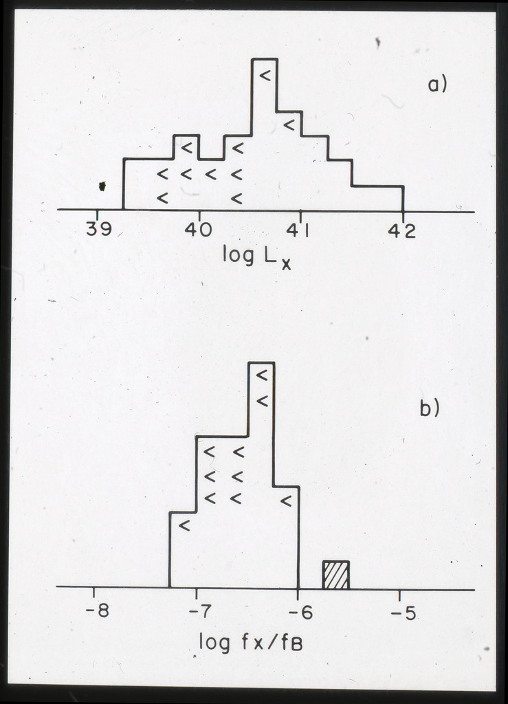 E/996 Distribution (a) of the X-ray luminosities L_x for the galaxies in the sample, and (b) Distribution of the X-ray to optical flux ratios of f_x/f_B. The hatched box represents NGC6876 for which only a Harvard Magnitude is listed in deVaucouleurs, de Vaucouleurs, and Corwin (1976). |