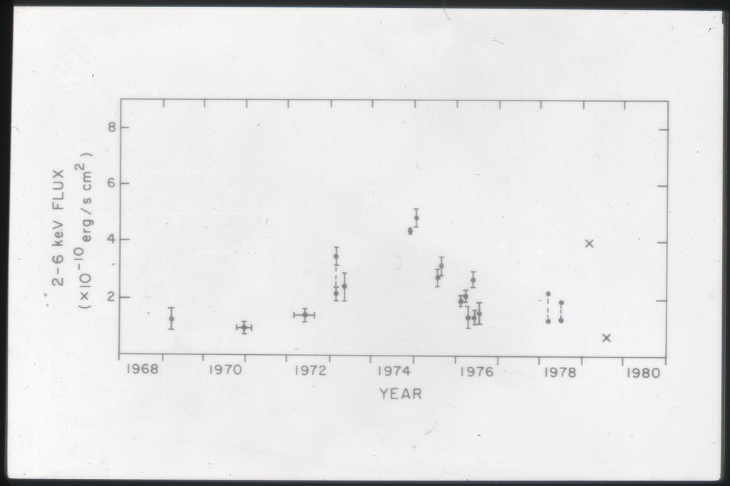 E/1008 Comparison between the x-ray, H alpha, blue light (disk and arms), far-infrared, neutral hydrogen, molecular hydrogen (derived from CO) and 21~cm radio continuum surface brightness profiles. The x-ray points are plotted on a composite of Figure~6 from Scoville and Young (1983). The x-ray data points have been corrected for the inclination of M51 (i = 20 deg) as in Scoville and Young (1983). X-ray points for R < 2~kpc are not plotted because off scale. All curves have been arbitrarily normalized. |