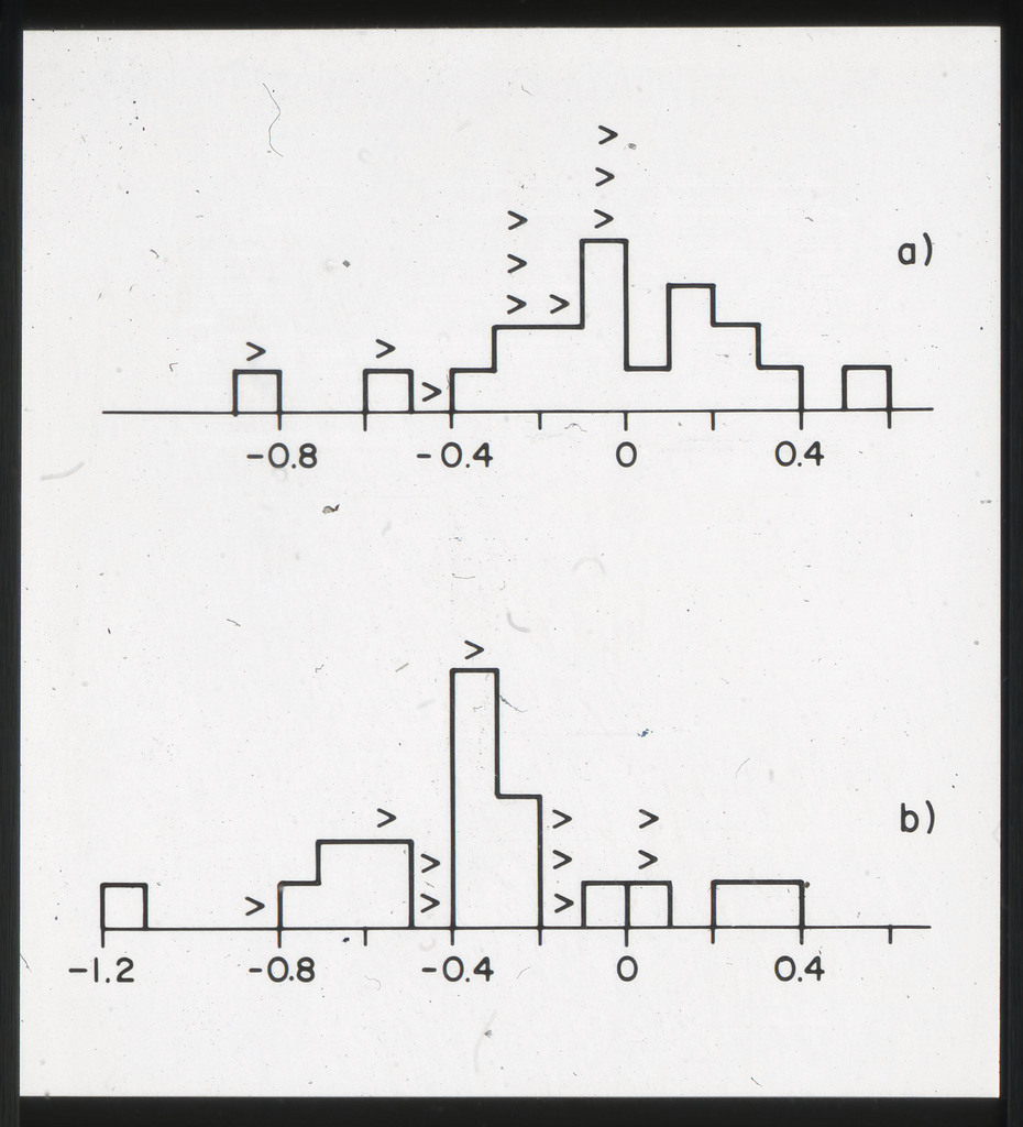 E/999 (a) Distribution of the residuals obtained for the elliptical and SO galaxy sample after subtracting the best fit log l_x = 1.64 log l_B - 25.4. (b) Same as (a) but using log l_x = 1.08 ell_B - 9.2. |