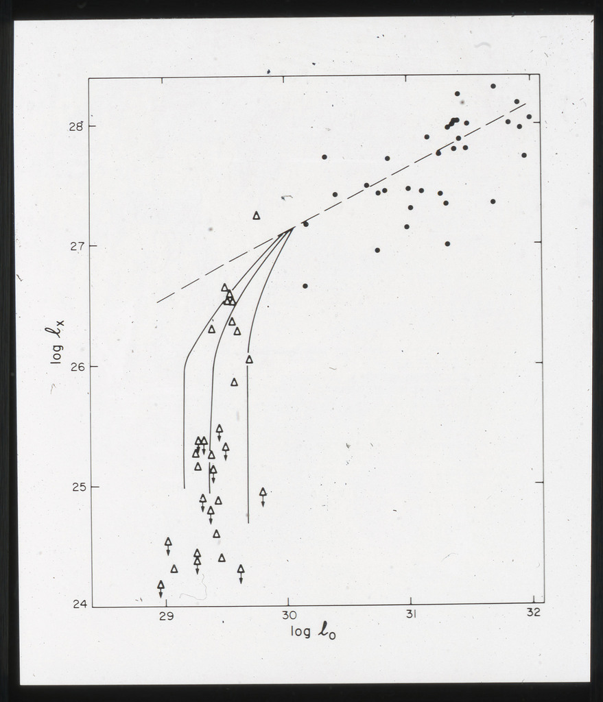 E/1002 The monochromatic X-ray luminosity of 3CR quasars and 3CR galaxies plotted as a function of optical luminosity. Dashed line represents the best fit to the 3CR quasar data. The solid lines represent how this best fit is modified when the effect of the whole galaxy is considered for three different optical luminosities. |