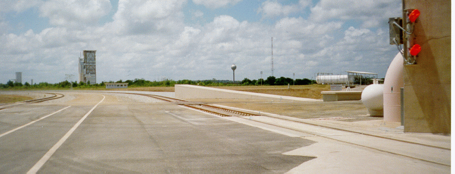 ELA2 area after gantry rollback. The Ariane 4 assembly building is on the left of the picture and V113 and its launch tower are on the right. The building in the center is Arianespace's offices.