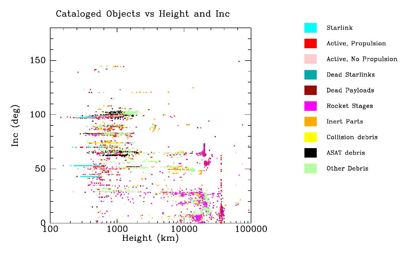Sat and Debris Population - number vs height and inc
