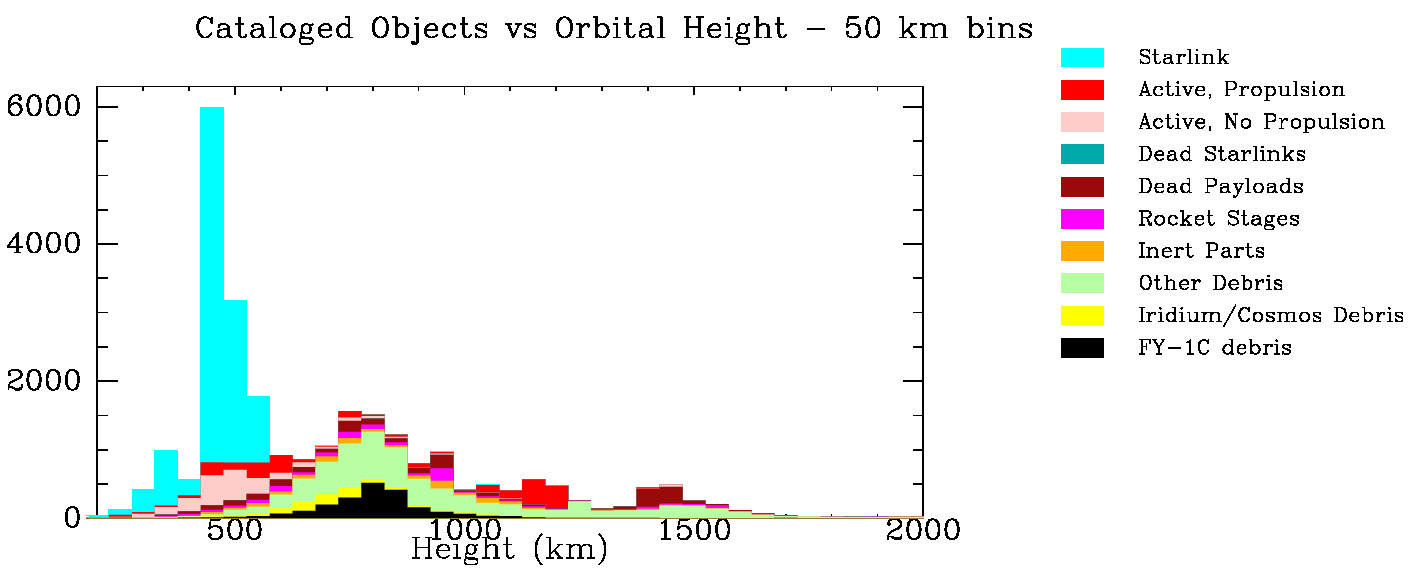 LEO Sat and Debris Population - number vs height, 50 km bins